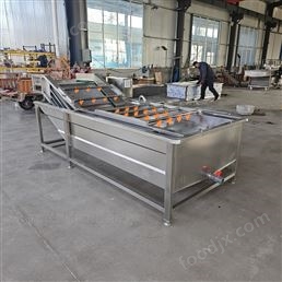 工作原理:利用高压水泵使箱体水槽中的水形成循环,涡流风机将空气输入到箱体水槽底部形成气泡,气泡带动水流翻动,使蔬菜翻滚,同时气泡在与蔬菜接触时破裂产生的能量,对蔬菜表面起到冲击和刷洗作用,再结合输送网